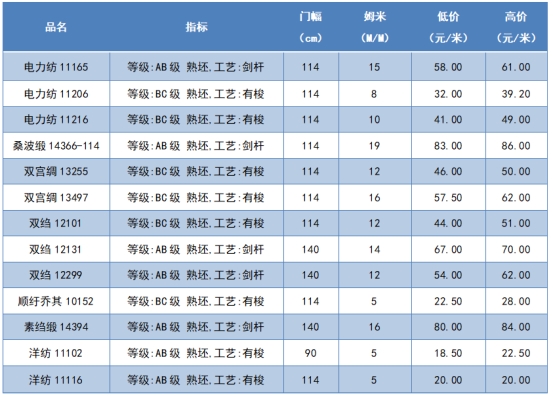 本周綢緞指數(shù)協(xié)作單位成交價格區(qū)間