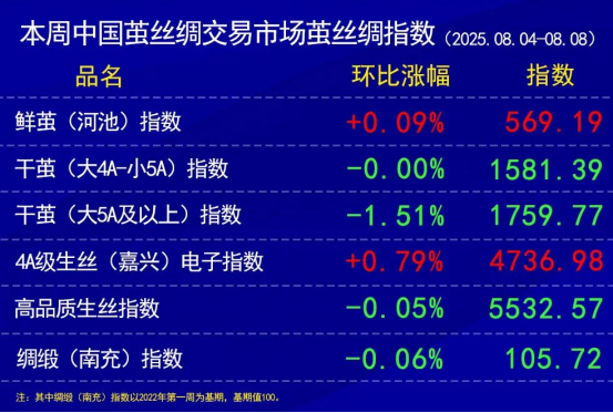 高品質(zhì)生絲價格本周延續(xù)強勢震蕩格局,但成交表現(xiàn)仍顯平淡,本周生絲指數(shù)環(huán)比微幅收綠,整體保持基本持平。