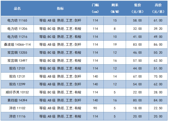本周綢緞指數(shù)協(xié)作單位成交價格區(qū)間