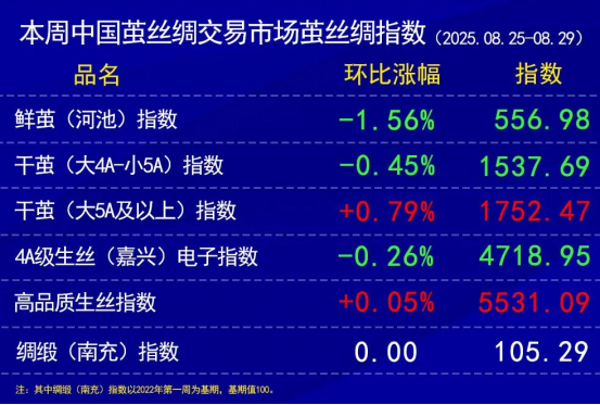 高品質(zhì)生絲價(jià)格指數(shù)方面,本周維持價(jià)維穩(wěn)成交一般的運(yùn)行特點(diǎn),希望九月內(nèi)外銷變化引領(lǐng)指數(shù)走出窄幅振蕩區(qū)。