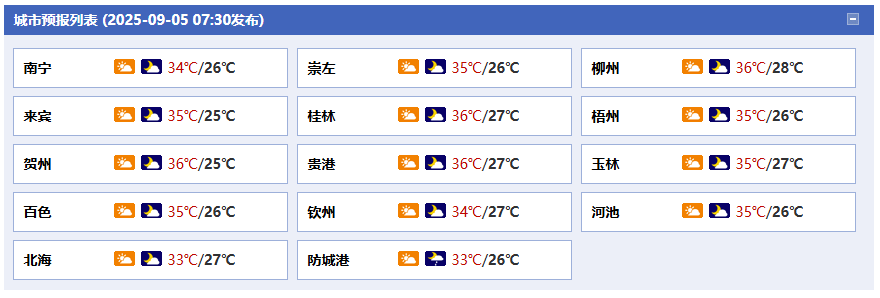 6日白天到晚上,全區(qū)多云,其中桂南、桂東有分散陣雨或雷雨、局地中雨。全區(qū)大部最高氣溫34~36℃、局地37℃以上。