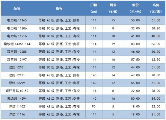 本周綢緞指數(shù)協(xié)作單位成交價格區(qū)間