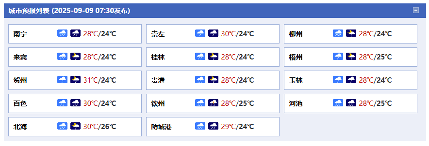 南寧市:今天白天有大雨、局地暴雨,晚上有中雨、局地大雨,偏南風2~3級,最高氣溫28℃,最低氣溫24℃。