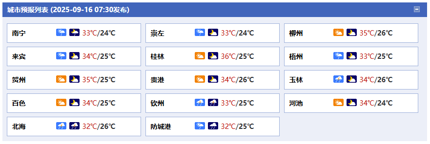 南寧市:今天白天到晚上,多云、有短時陣雨或雷雨,東南風1~2級,最高氣溫33℃,最低氣溫25℃。