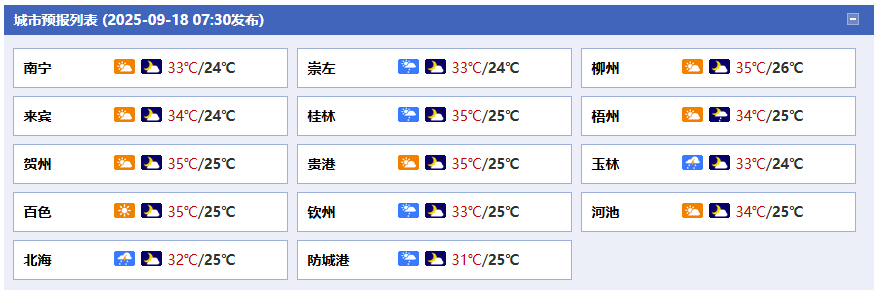 南寧市:今天白天多云、局地有陣雨或雷雨,今天晚上多云,偏東風(fēng)1~2級(jí),最高氣溫33℃,最低氣溫25℃。