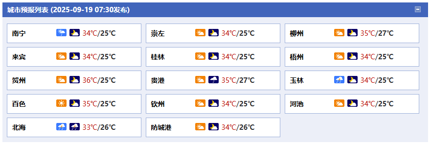 南寧市:今天白天到晚上,多云間晴、局地有陣雨或雷雨,東北風1到2級,最高氣溫34℃,最低氣溫25℃。