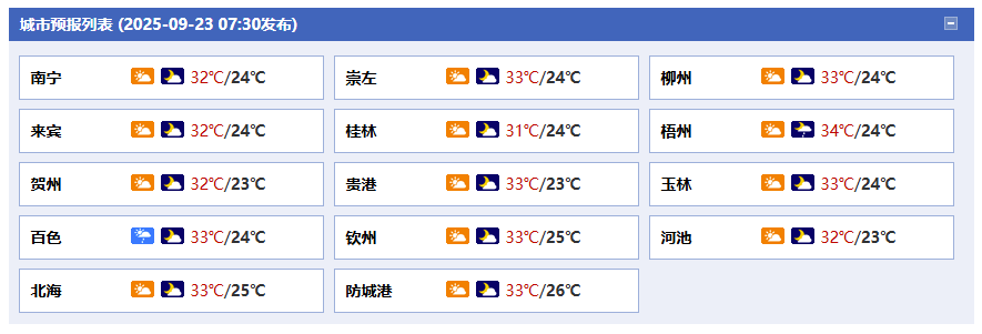 南寧市:今天白天到晚上,多云、局地有陣雨或雷雨,偏北風2~3級,最高氣溫34℃,最低氣溫24℃。