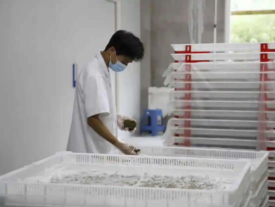 飼料養(yǎng)蠶很大優(yōu)勢(shì)在于節(jié)省人力。陳安介紹:“蠶有5個(gè)生長(zhǎng)齡期,傳統(tǒng)養(yǎng)殖方式下,每天需要桑葉喂養(yǎng)3次,而飼料養(yǎng)殖每一個(gè)齡期只喂兩次就夠了,喂一次可以吃兩到三天?!?o:p>