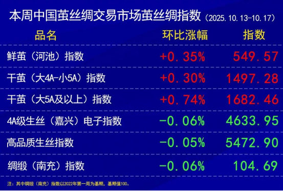 今日(2025年10月17日,周五)中國繭絲綢交易市場生絲電子指數微跌0.04%收于4633.95點,本周生絲指數累計下跌0.06%。B絲2022D(商檢4A級生絲):251025合約下跌0.06萬元報收于46.08萬元;260325合約上漲0.03萬元報收于46.65萬元;260925合約下跌0.03萬元報收于46.53萬元。