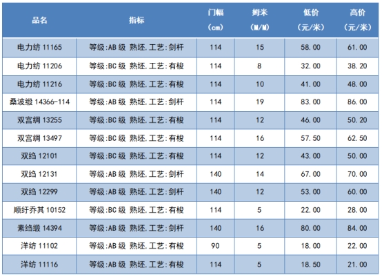 本周綢緞指數協作單位成交價格區(qū)間