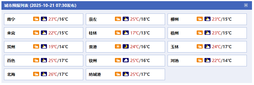 昨天08時到今天(21日)08時,廣西大部最高氣溫都低于30℃,其中桂北、桂中大部最高氣溫低于25℃,桂林、柳州、百色、河池、賀州5市局地最高氣溫只有15~19℃;全區(qū)大部最低氣溫低于20℃,其中偏北的地方最低氣溫只有12~15℃。