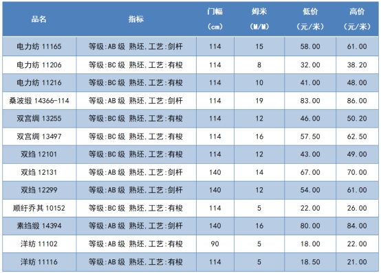 本周綢緞指數(shù)協(xié)作單位成交價(jià)格區(qū)間