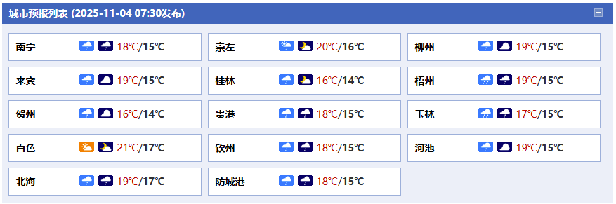 昨天到今日清晨,廣西大部被陰沉天色籠罩,涼意十足。據(jù)氣象數(shù)據(jù)顯示,4日08時前24小時,全區(qū)普降小到中雨,局地出現(xiàn)大雨天氣。在雨水打壓下,氣溫繼續(xù)下降。今早08時,廣西各地氣溫均跌至 “1 字開頭”,其中南丹寒冷感尤為明顯,氣溫低至11.2℃。