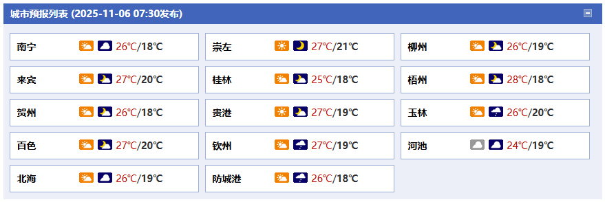 南寧市:今天白天到晚上,陰天到多云、局地有小雨,偏東風(fēng)1~2級,最高氣溫26℃,最低氣溫19℃。