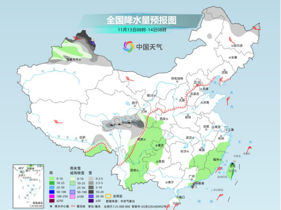 中央氣象臺預(yù)計(jì),今天,新疆北部、內(nèi)蒙古東部、黑龍江北部、西北地區(qū)中部、川西高原北部、西藏東部等地部分地區(qū)有小到中雪或雨夾雪,其中,新疆北疆北部和北疆東部、川西高原北部等地部分地區(qū)有大到暴雪,局地大暴雪。新疆沿天山地區(qū)和伊犁河谷、西藏東南部、西北地區(qū)東南部、江南南部、西南地區(qū)東部和南部、廣東東部和東南部沿海、臺灣島等地部分地區(qū)有小到中雨,其中,臺灣島北部等地部分地區(qū)有大雨。