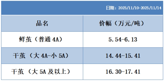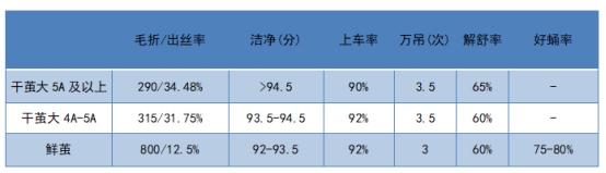 干繭價(jià)格指數(shù)方面,仍由全國鮮繭收烘與干繭貿(mào)易數(shù)據(jù)綜合構(gòu)成。其中,大 4A 至小5A干繭價(jià)格指數(shù)環(huán)比上周有所下滑,而大 5A 及以上干繭價(jià)格指數(shù)環(huán)比有所收紅,反映市場對高品質(zhì)干繭的需求仍相對穩(wěn)健。