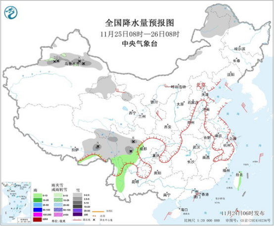 進(jìn)入11月下旬,影響我國(guó)的冷空氣較為頻繁。目前,一股較強(qiáng)冷空氣正自西向東影響我國(guó),今明天(11月24日至25日),冷空氣繼續(xù)東移南下,東北、華北東部到華南等地都將出現(xiàn)降溫。緊接著,25日至27日,又將有新一股冷空氣影響我國(guó)。此外,我國(guó)西南地區(qū)、東北等地雨雪天氣頻繁,局地或現(xiàn)大雪。