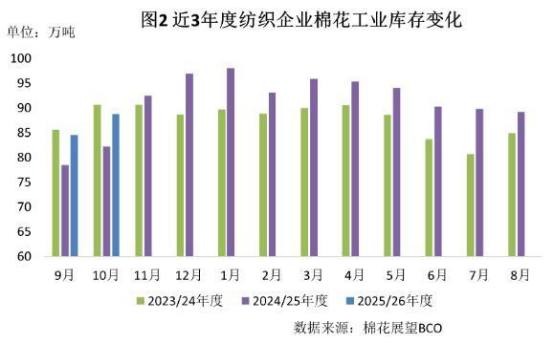 新棉大量上市,市場上可選資源增多,有補庫需求的紡紗企業(yè)開始采購,原料庫存有所上升。截至10月底紡織企業(yè)在庫棉花工業(yè)庫存量為88.8萬噸,較上月底增加4.3萬噸。紡織企業(yè)可支配棉花庫存量為106.7萬噸,較上月底增加3.4萬噸。其中:38%的企業(yè)增加棉花庫存,16%減少,46%基本保持不變。盡管新棉供應充足,但隨著下游即將進入傳統(tǒng)淡季,企業(yè)補庫的持續(xù)性仍需觀察。
