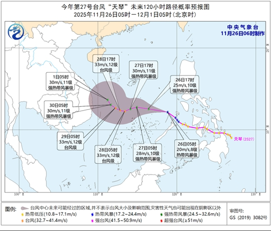 此外,海上還需關(guān)注今年第27號(hào)臺(tái)風(fēng)“天琴”。它已于今天凌晨移入南海,預(yù)計(jì),“天琴”將以每小時(shí)20至25公里的速度向偏西方向移動(dòng),強(qiáng)度逐漸加強(qiáng),最強(qiáng)可達(dá)臺(tái)風(fēng)級(jí),29日開(kāi)始逐漸轉(zhuǎn)向西偏北方向移動(dòng),向南海中西部海面靠近,強(qiáng)度緩慢減弱。