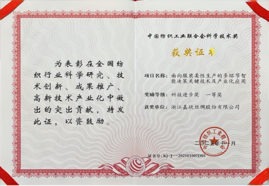 這是嘉欣絲綢首次獲得中國紡織行業(yè)的最高科技榮譽,這份沉甸甸的獎項,不僅是一份榮耀,更是對嘉欣絲綢在服裝生產(chǎn)數(shù)智化轉型道路上創(chuàng)新與實踐的國家級權威認可。