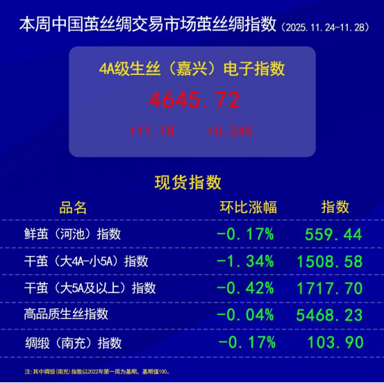 今日(2025年11月28日,周五)中國(guó)繭絲綢交易市場(chǎng)生絲電子指數(shù)微跌0.01%報(bào)收于4645.72點(diǎn),本周生絲指數(shù)累計(jì)上漲0.24%,本月生絲指數(shù)累計(jì)下跌0.85%。B絲2022D(商檢4A級(jí)生絲):251225報(bào)平,收于46.44萬(wàn)元;260325報(bào)平,收于46.65萬(wàn)元;260925合約報(bào)平,收于46.35萬(wàn)元。
