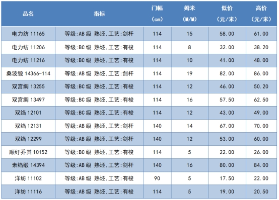 本周綢緞指數(shù)協(xié)作單位成交價(jià)格區(qū)間
