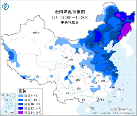 未來三天(12月1日至3日),受寒潮和補充冷空氣影響,我國大部氣溫下降,北方多地降溫明顯,局地降幅可達14至16℃,并伴有大風(fēng),公眾請注意防風(fēng)保暖。同時,大部地區(qū)雨雪稀少,天干物燥,南方雨水明天短暫增多,干燥暫時緩解。