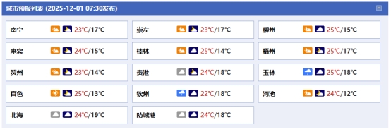 南寧市:今天白天到晚上,多云,偏北風(fēng)1~2級(jí),最高氣溫24℃,最低氣溫17℃。