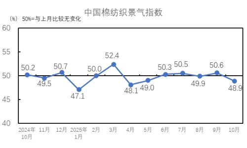 2025年10月,生產(chǎn)指數(shù)為48.4%,低于臨界點(diǎn),較9月下降2.7個(gè)百分點(diǎn),紡織廠生產(chǎn)較9月下降。從分項(xiàng)指數(shù)看,棉紡織廠設(shè)備開臺(tái)率指數(shù)為49.3%,低于臨界點(diǎn),較9月下降2.3個(gè)百分點(diǎn)。紗產(chǎn)量指數(shù)為48.4%,較9月下降1.4個(gè)百分點(diǎn);布產(chǎn)量指數(shù)為46.3%,較9月下降5.4個(gè)百分點(diǎn);紗產(chǎn)量指數(shù)和布產(chǎn)量指數(shù)均低于臨界點(diǎn)。