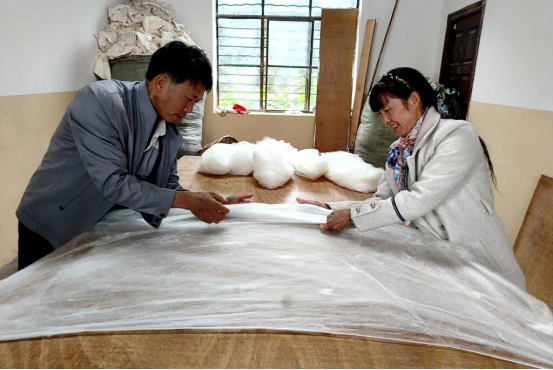 作為阿都鄉(xiāng)的手工蠶絲被老手藝人,他們每年4月份就著手養(yǎng)蠶,經(jīng)過(guò)45天的育苗、育蠶、結(jié)繭化蛹就可以采繭,再經(jīng)過(guò)煮繭、清洗、抽絲拉綿、晾曬,便可以進(jìn)行蠶絲被的制作。