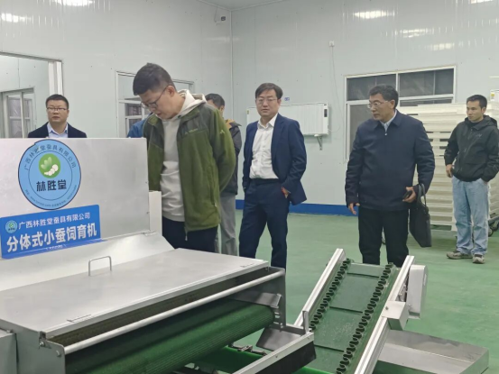 隨后,調(diào)研組深入林勝堂的智能化小蠶共育室進(jìn)行實(shí)地考察。在這里,調(diào)研組近距離觀摩了從桑葉切削到精準(zhǔn)投喂的智能化全流程操作,詳細(xì)了解了從桑葉的切削輸送、消毒喂葉及溫濕度等環(huán)境因子的全自動(dòng)智能調(diào)控等關(guān)鍵技術(shù)環(huán)節(jié),極大提升了勞動(dòng)效率,展現(xiàn)了現(xiàn)代科技對(duì)傳統(tǒng)蠶桑產(chǎn)業(yè)的深刻變革。