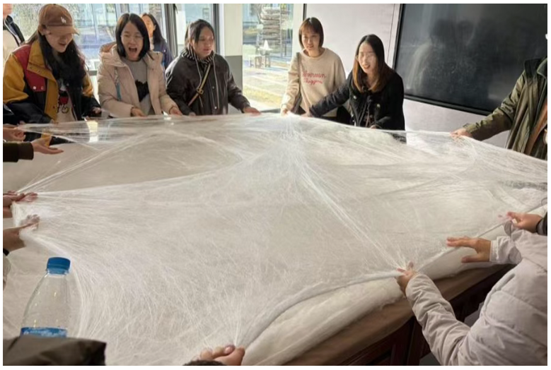 調(diào)研期間,保護中心一行實地參觀了蠶桑養(yǎng)殖和手工技藝展示區(qū)。在太湖雪工作人員的指導(dǎo)下,保護中心人員有序參與剝棉兜、拉制蠶絲被等工藝實操體驗,直觀感受蠶桑傳統(tǒng)技藝的獨特魅力。