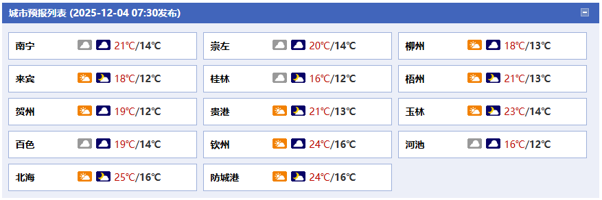 今天08時過去24小時,廣西全區(qū)雨水依舊較少;最高氣溫:桂南部分地區(qū)20~24℃,其余地區(qū)1字開頭;最低氣溫:桂北局地只有個位數(shù),其余大部10~16℃,氣溫最低的桂林資源縣,僅4.6℃。預計,今天白天,百色、河池、崇左等市陰天有分散小雨,其它地區(qū)多云到陰天。今天晚上,百色、河池、崇左等市陰天大部有小雨,其它地區(qū)陰天到多云有分散小雨。5日白天到晚上,桂西陰天部分地區(qū)有小雨,其它地區(qū)陰天到多云有分散小雨。6日白天到晚上,桂西北陰天大部有小雨,其它地區(qū)多云。