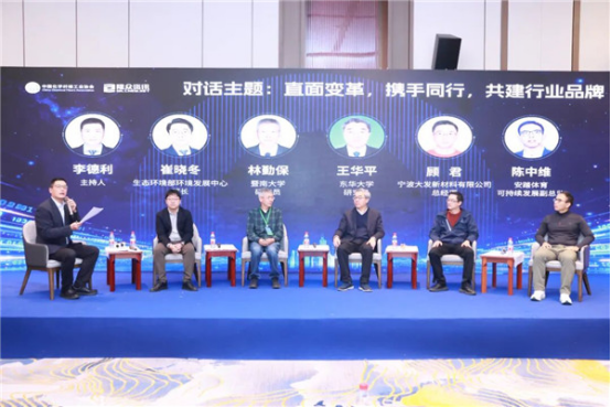 在對話環(huán)節(jié),主持人中國化學(xué)纖維工業(yè)協(xié)會循環(huán)再利用化學(xué)纖維分會秘書長李德利與東華大學(xué)研究員王華平、暨南大學(xué)教授林勤保、生態(tài)環(huán)境部環(huán)境發(fā)展中心部長崔曉冬、寧波大發(fā)新材料有限公司總經(jīng)理顧君、安踏集團(tuán)可持續(xù)發(fā)展副總監(jiān)陳中維,圍繞循環(huán)再利用化學(xué)纖維行業(yè)發(fā)展趨勢、品牌方對再生材料需求及要求、生產(chǎn)工藝技術(shù)路徑選擇、經(jīng)濟(jì)效益和社會效益的矛盾與抉擇、再生纖維鑒別方法及應(yīng)用、碳匯核算機(jī)制等行業(yè)焦點(diǎn)問題展開深入探討。