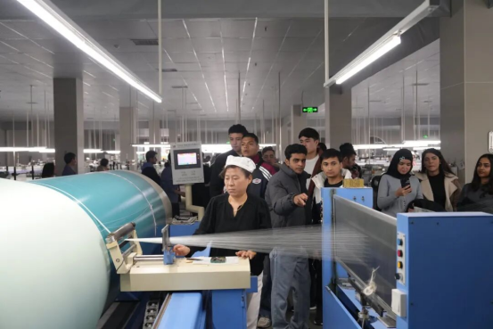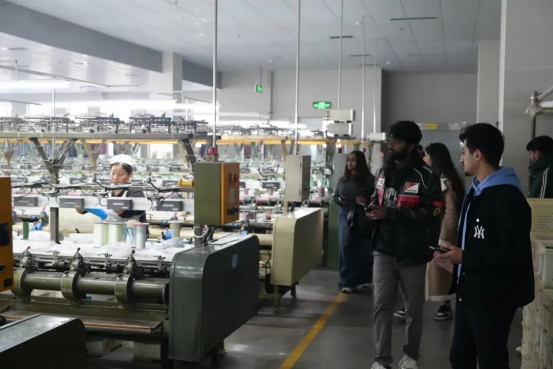 國際學(xué)生們來到生產(chǎn)一線,參觀了織造、染整車間,他們近距離觀摩了絲線如何化為綢緞,染料與布匹如何交融。各國青年匯聚在織機旁,染缸前,每一次提問,每一次交流,都為古老的絲綢文化注入新的活力。