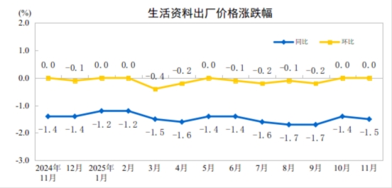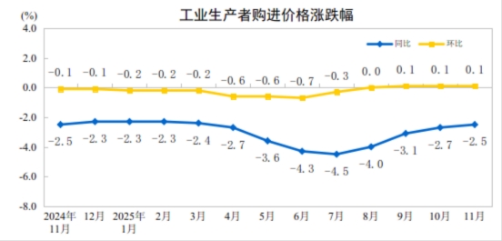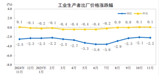 2025年11月份,全國工業(yè)生產(chǎn)者出廠價格同比下降2.2%,工業(yè)生產(chǎn)者購進價格同比下降2.5%;工業(yè)生產(chǎn)者出廠價格和購進價格環(huán)比均上漲0.1%,漲幅均與上月相同。1—11月平均,工業(yè)生產(chǎn)者出廠價格比上年同期下降2.7%,工業(yè)生產(chǎn)者購進價格下降3.1%。