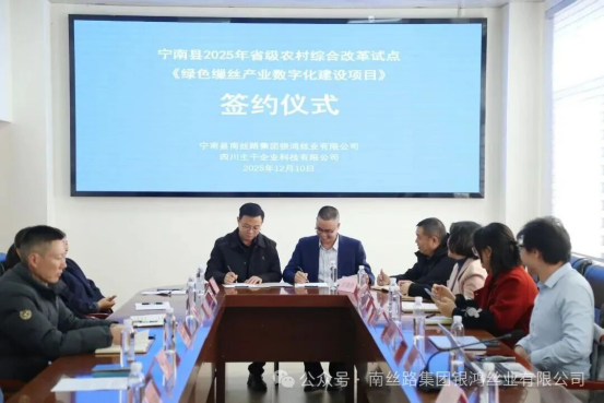 在全場見證下,銀鴻絲業(yè)與主干企服科技公司正式簽署戰(zhàn)略合作協(xié)議,全體參會人員以“F9數(shù)智絲業(yè)·南絲路綠色繅絲產(chǎn)業(yè)數(shù)字化建設項目啟動儀式”的橫幅為背景定格瞬間,雙方負責人握手合影環(huán)節(jié)更彰顯企業(yè)協(xié)同、產(chǎn)學研融合的堅定決心。隨著啟動會的圓滿落幕,銀鴻絲業(yè)正以數(shù)字化為筆,在鄉(xiāng)村振興的畫卷上書寫綠色發(fā)展的新篇章。