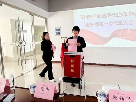 一場屬于絲綢紡織行業(yè)女性的盛會(huì),在冬日暖陽中織就出合作與發(fā)展的新圖景。2025年12月11日下午,蘇州市絲綢紡織行業(yè)婦聯(lián)成立大會(huì)暨婦女第一次代表大會(huì)在華佳集團(tuán)辦公大樓二樓培訓(xùn)室隆重召開。來自全市絲綢行業(yè)的26名婦女代表齊聚一堂,共商行業(yè)女性發(fā)展大計(jì),共同見證這一具有里程碑意義的時(shí)刻。華佳集團(tuán)董事長俞金鍵當(dāng)選為蘇州市絲綢紡織行業(yè)婦聯(lián)第一屆主席。