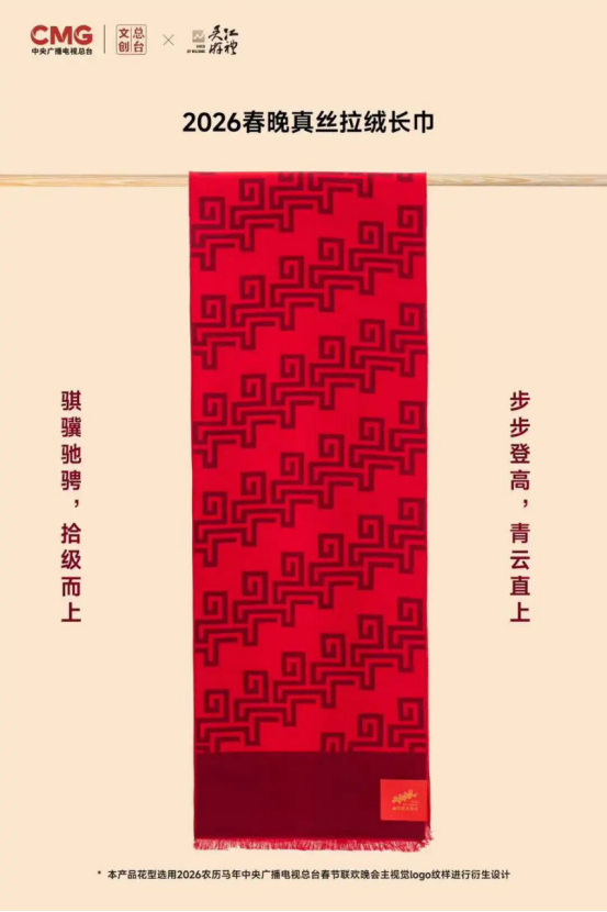 12月10日,中央廣播電視總臺《2026年春節(jié)聯(lián)歡晚會》發(fā)布主題和主標(biāo)識,其主標(biāo)識為“騏驥馳騁紋”,同款紋樣的紅圍巾同步亮相。這抹承載著團圓期盼的“吳江紅”,已是總臺文創(chuàng)與“吳江游禮”的第三年聯(lián)名之作。