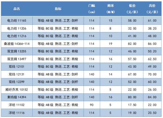 本周綢緞指數(shù)協(xié)作單位成交價(jià)格區(qū)間