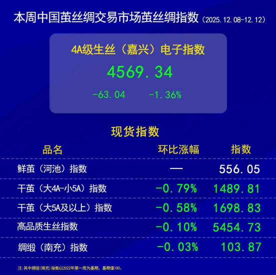 今日(周五)生絲盤面各遠(yuǎn)近合約延續(xù)下跌態(tài)勢,本周5個(gè)交易日均收陰線,生絲電子指數(shù)累計(jì)下跌1.36%,報(bào)收于4569.34點(diǎn),本周跌幅創(chuàng)下半年以來新高,直觀反映進(jìn)入12月后,尤其是本周繭絲綢產(chǎn)業(yè)鏈的傳導(dǎo)格局