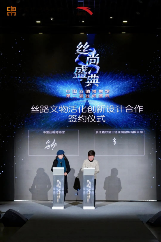 為更好“讓文物活起來”,開幕式上中國(guó)絲綢博物館與“中華老字號(hào)”百年絲綢品牌金三塔簽訂戰(zhàn)略合作協(xié)議,雙方將圍繞絲綢文物活化設(shè)計(jì)及文創(chuàng)開發(fā)等內(nèi)容建立長(zhǎng)期合作關(guān)系,共同推動(dòng)浙江經(jīng)典產(chǎn)業(yè)——絲綢與時(shí)尚產(chǎn)業(yè)融合發(fā)展。